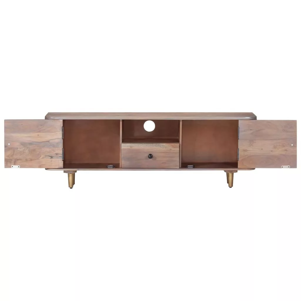 A TV-állvány tömör akácfából készült, egy sűrű erezetű keményfából, így stabil és tartós. A vaslábak extra stabilitást biztosítanak, a masszív tetejére pedig dekorációs tárgyakat helyezhet. A tárolórekesz és a fiókok bőséges helyet biztosítanak a multimédiás készülékek, könyvek és egyéb tárgyak tárolásához.