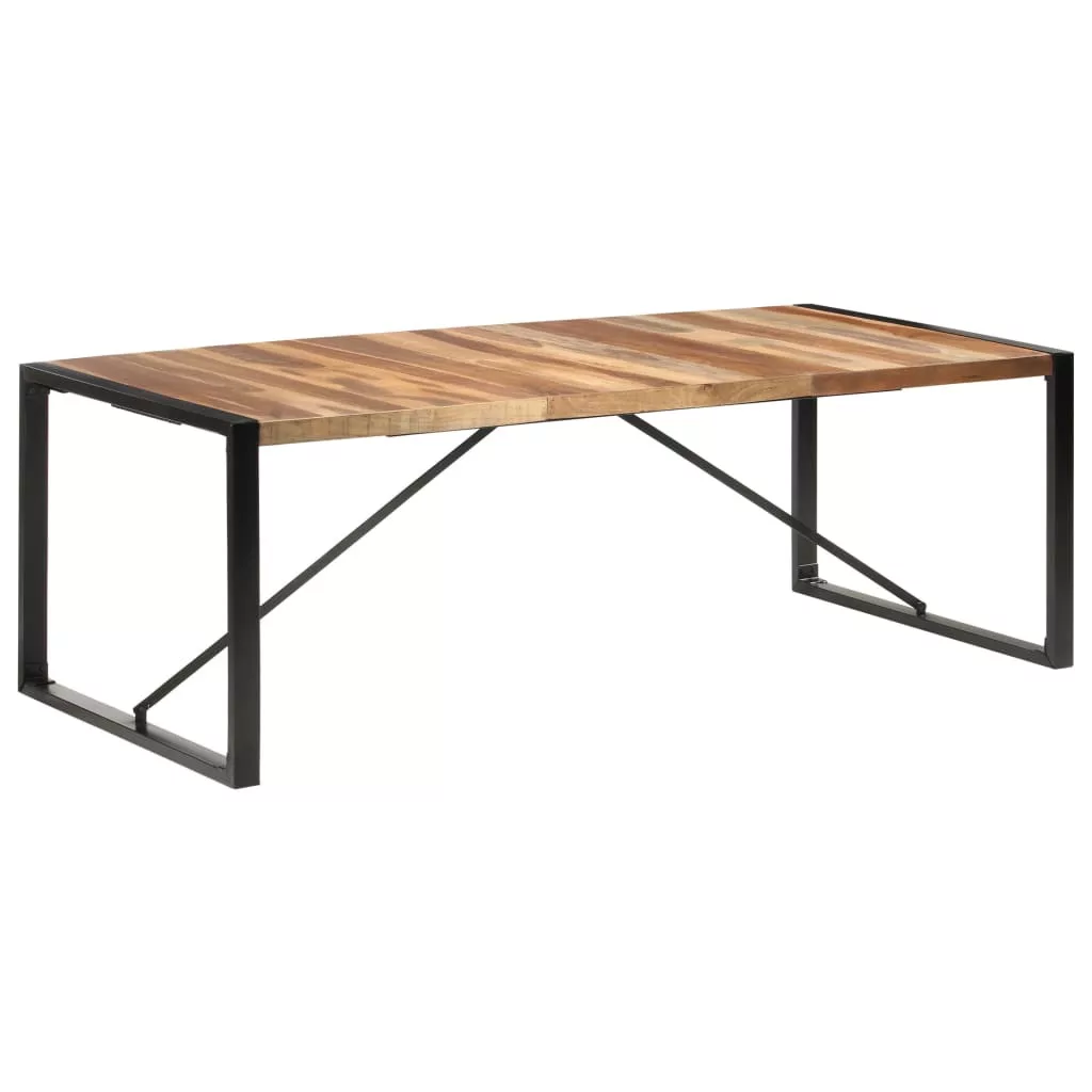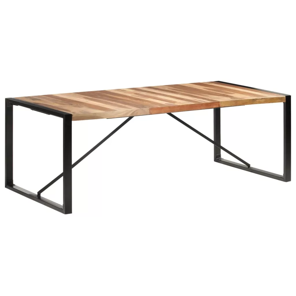 Ez a kelet-indiai rózsafa felületű fa asztal tömör akácfából és gumifából készült. A tömör akácfa egy sűrű erezetű keményfa. A nyers akácfa elbírja a ránehezedő súlyt, és ellenáll a kopásnak. Az étkezőasztal teljes egészében kézzel készült, valamint a folyamat minden lépését a legnagyobb odafigyeléssel hajtották végre, lenne szó a csiszolásról, a festésről vagy a lakkozásról. Az acéllábak hozzájárulnak az asztal ipari megjelenéséhez és stabil szerkezetéhez. A masszív asztallap tökéletes italok, vázák és egyéb dekorációk elhelyezésére.
