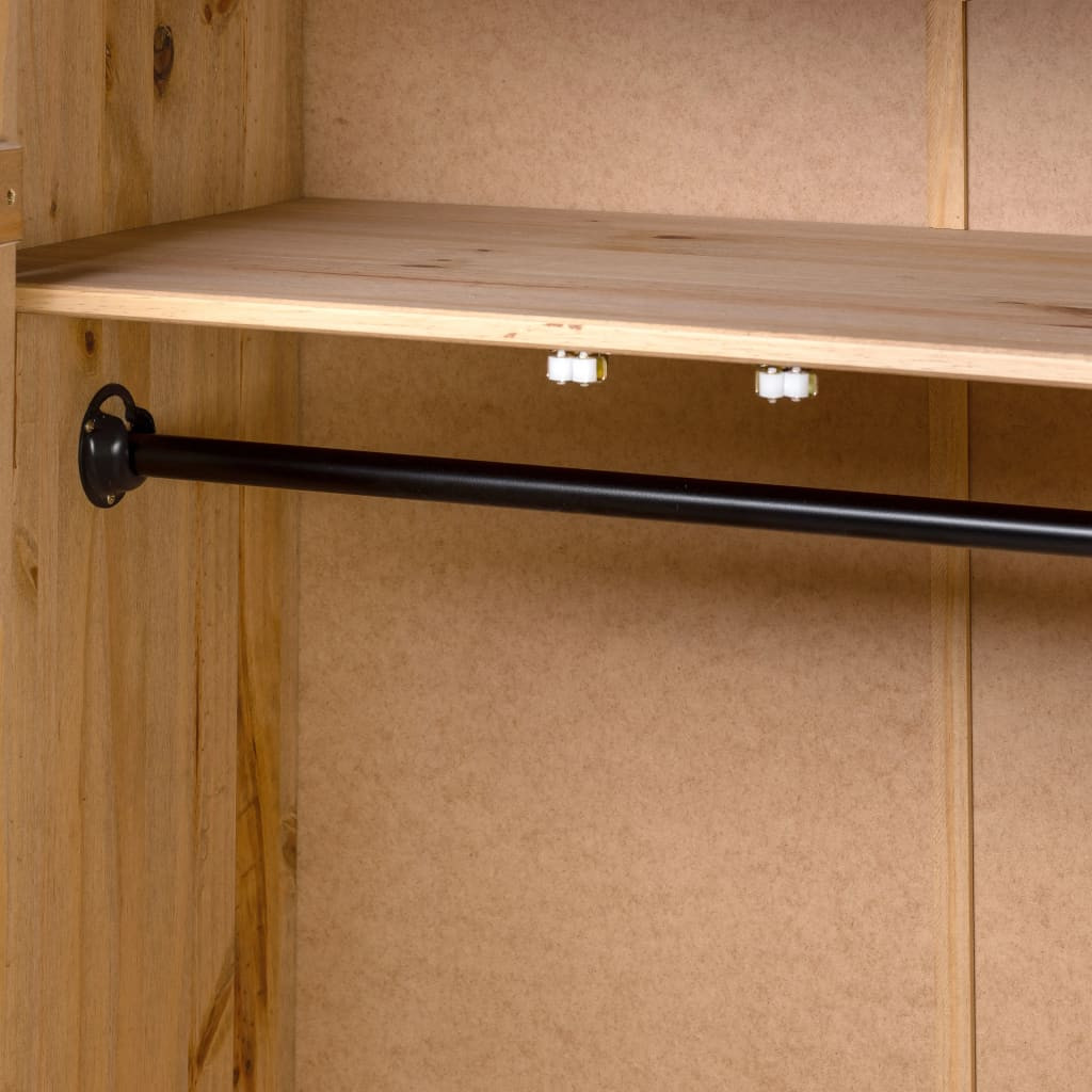 A ruhásszekrényben rögzített polc található cipők, pulóverek, farmerek, sapkák, kézitáskák stb. tárolására és rendszerezésére. A nagy rekesz akasztóval lett felszerelve, így kabátok, ruhák stb. akasztására használhatja. A tömör fenyőfából készült gardrób masszív és hosszú távú használatot biztosít.