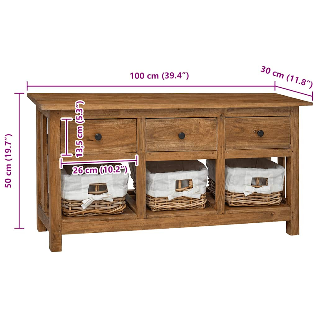 Ez a komód rusztikus bájt kölcsönöz otthona dekorációjának. Tömör, újrahasznosított fából készült, a kopott stílus minden egyes darabnak egyedi megjelenést kölcsönöznek, hozzájárulva látványos vintage megjelenéséhez. 3 fiókkal és 3 kivehető rattan kosárral rendelkezik.