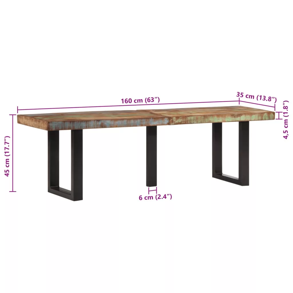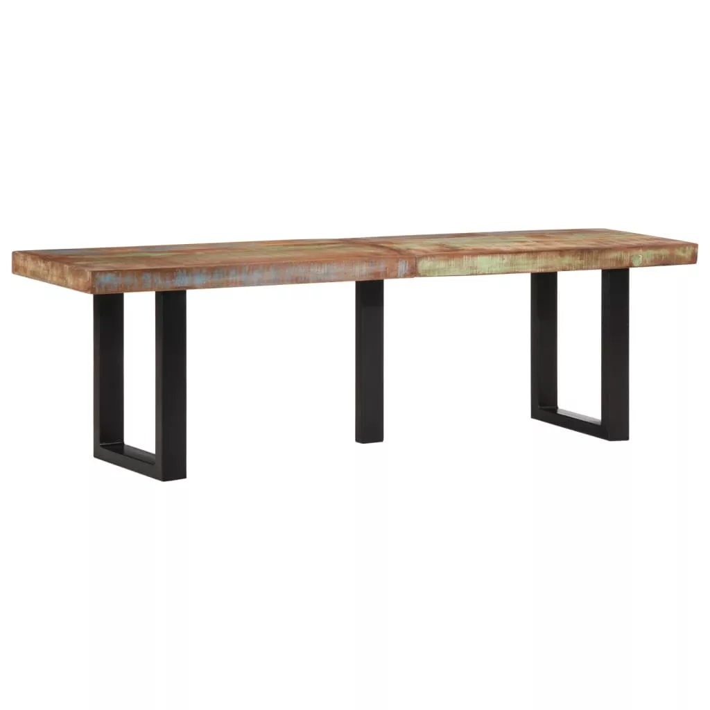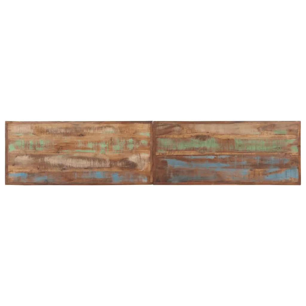 - Tömör újrahasznosított fa: A pad tömör újrahasznosított fából készült. A tömör újrahasznosított fa újból felhasznált faanyagokból, például tíkfából, mangófából, fenyőfából vagy bükkfából áll. Ezeket a faanyagokat régi épületekből, például gyárakból, fészerekből és hajókból hasznosítják újra. Mivel minden darab kézzel készül, a színek darabonként változhatnak.