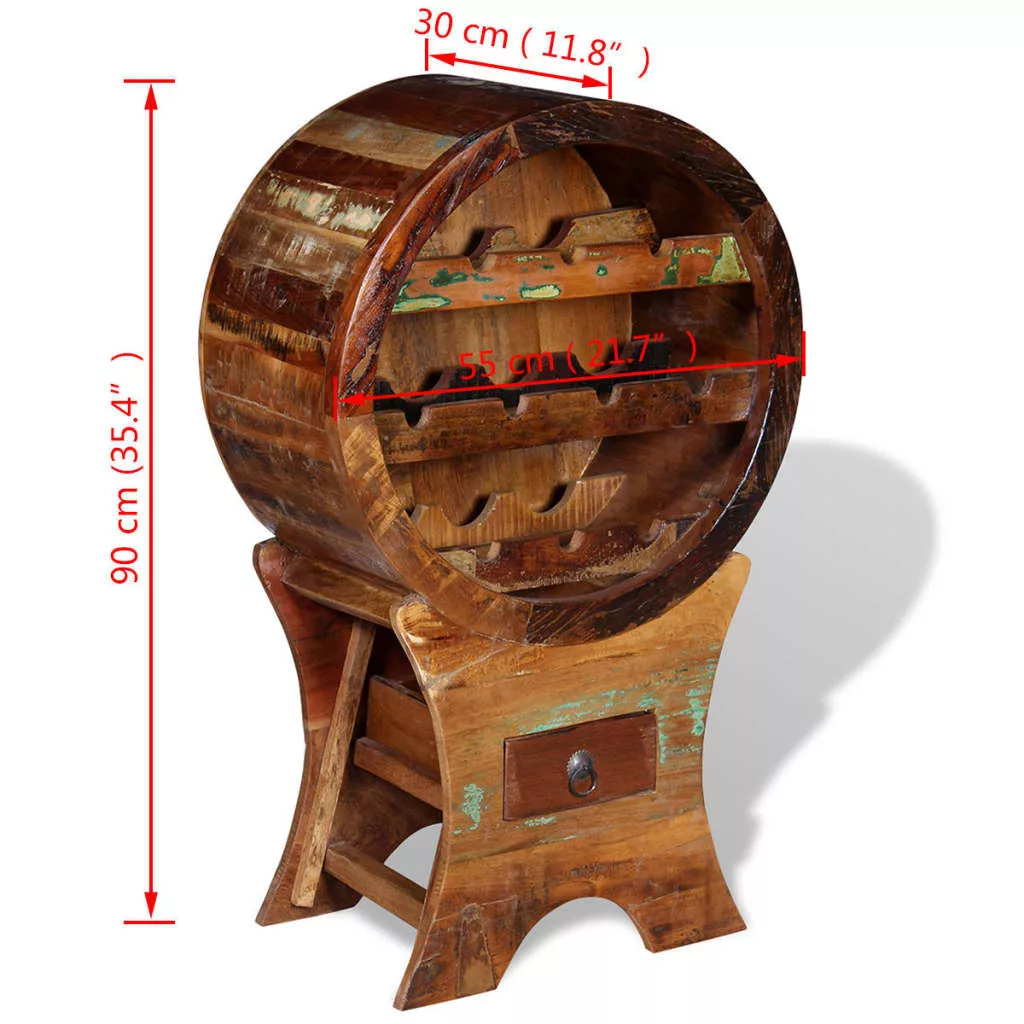 Újrahasznosított fából készült, így ez a bortartó állvány stabil, strapabíró és gyönyörű, és olyan különböző fa típusok jellegzetességeit egyesíti magában, mint például a tíkfa, mangófa, akácfa, újrahasznosított fa, keményfa, és így tovább. A bútordarab minden egyes példánya egyedi, kissé eltér a többitől. A kopás és a fa erezetbeli eltérésének jelei minden egyes darabnak egyedi külsőt kölcsönöznek és hozzájárulnak az antik stílushoz.