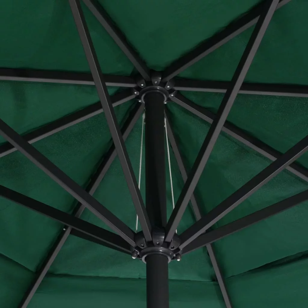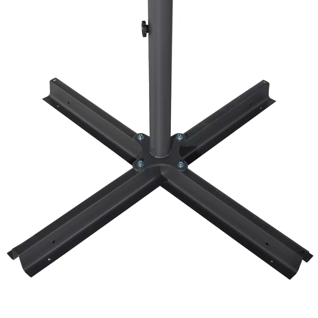 Az UV-védő és fakulásgátló poliészterből készült napernyőhuzat optimális védelmet nyújt a nap sugaraival szemben, és könnyen tisztítható. Erős kereszttalppal rendelkezik a stabilitás növelése érdekében. Az erős alumínium rúdnak és a 8 strapabíró bordának köszönhetően a napernyő nagyon stabil és tartós. Kerti napernyőnk a kézikarral könnyen nyitható és csukható. A terméket könnyű összeszerelni.