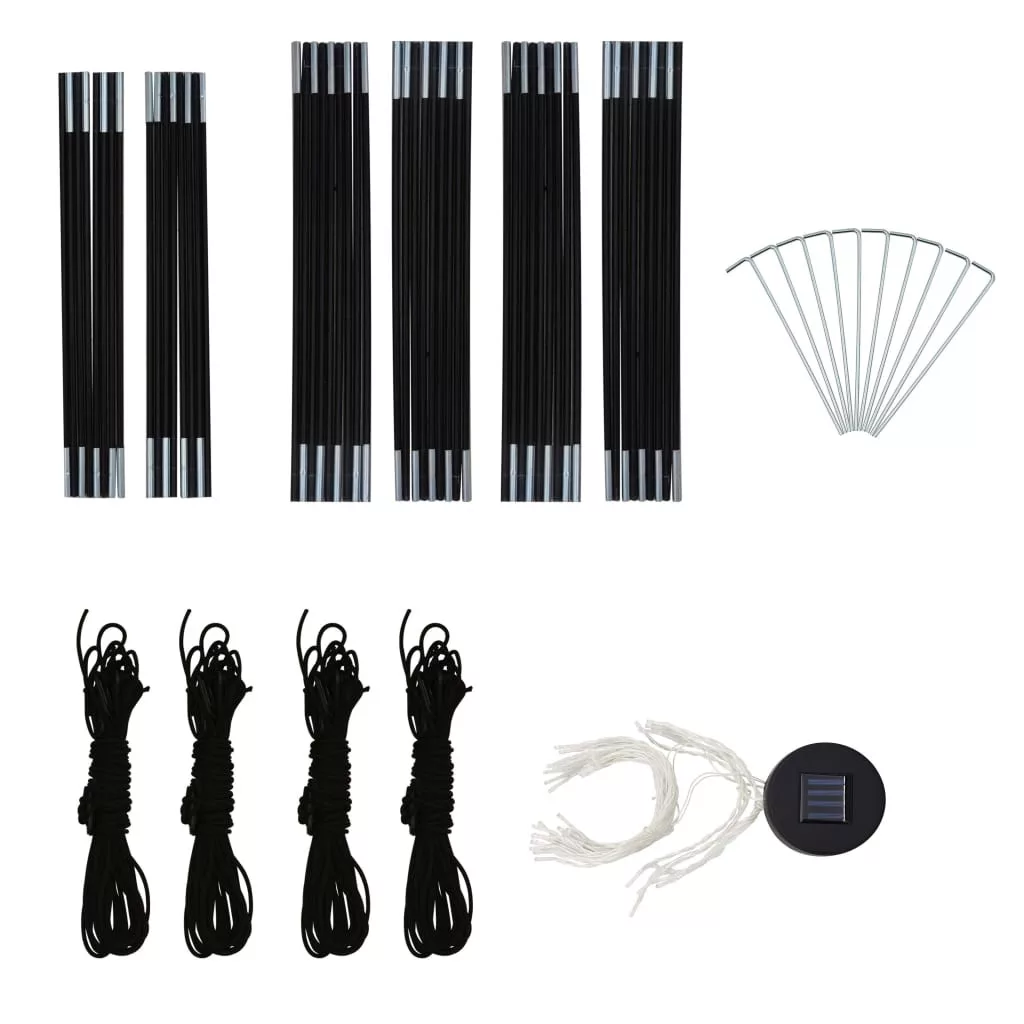 A rendezvénysátor 100% PA bevonatú poliészter anyagból készült, így UV álló. A váz robusztus üvegszálból készült, ezért ellenáll a rozsdának és könnyű is. A négy mellékelt "szúnyogháló" oldalfal ideális védelmet nyújt mindenféle rovar ellen. Cipzárral lettek ellátva, így pillanatok alatt rögzíthetők. Ezenkívül a 96 LED-es világítás kézzel is egyszerűen ki-be kapcsolható, a mellékelt napelemmodul pedig nappal tölti a beépített akkumulátort.